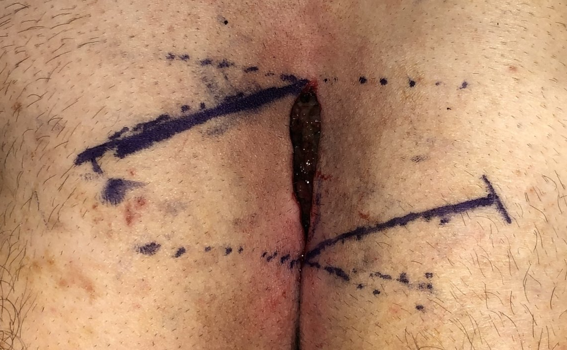 - Excision and Reconstruction with Flap Procedure - This is Dr. Chandler's preferred option of closure. Flap closure allows the suture line to be moved out of the gluteal crease and avoids a closure that is directly over the midline, avoiding high pressure and excess moisture. Two methods Dr. Chandler uses are the Z-plasty technique and the Karydakis flap technique. The downside of flap closure is slightly longer surgery and larger scars, but with a chance for better healing, with a lower cyst recurrence rate and lower risk of wound breakdown. Z-plasty involves the creation of two triangular flaps around the area that are then transposed across each other.